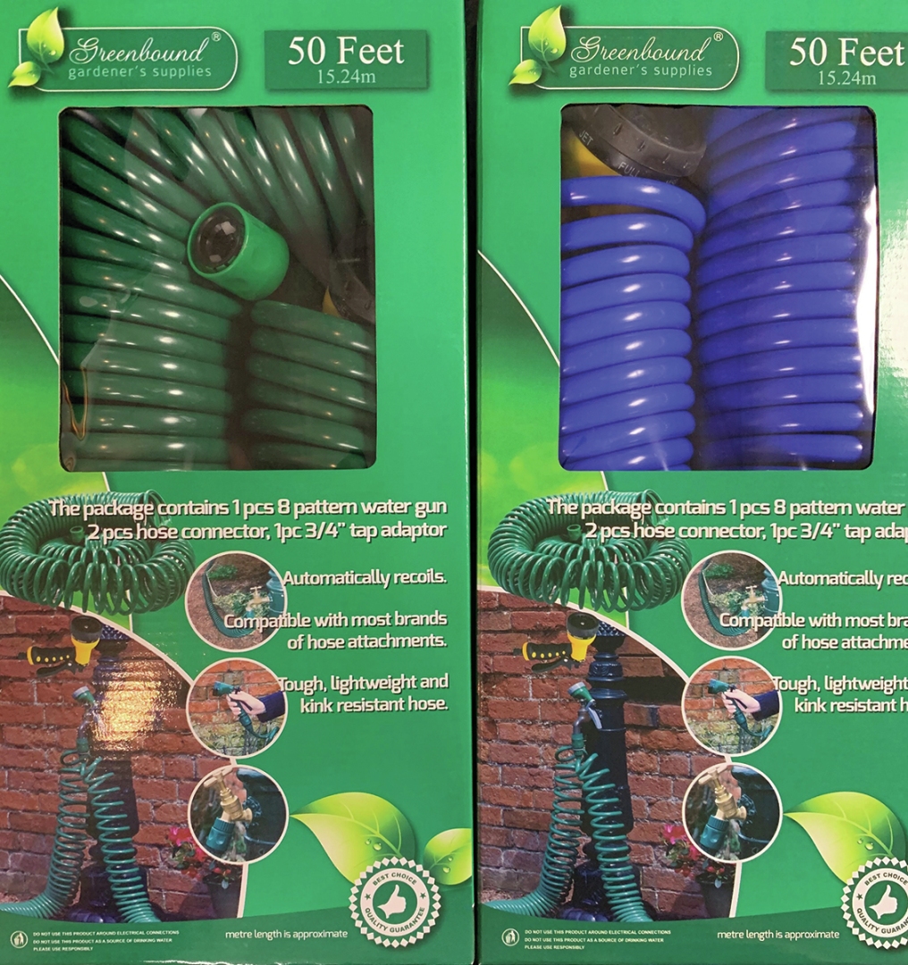 3/8" x 50' Recoil Garden Hose Kit with Sprayer and Quick Coupler. 4 of Each Color Per Case