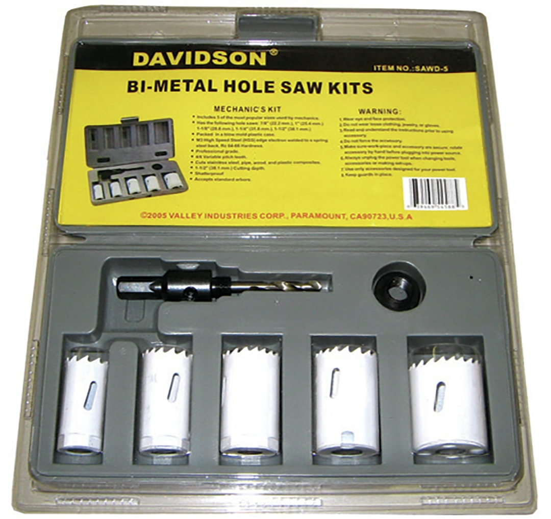 Has the following hole saws: 7/8", 1", 1-1/8", 1-1/4", 1-1/2" Packed in a blow mold plastic case. M3 High Speed Steel (HSS) edge electron welded to a spring steel back, Rc-64-66 Hardness Professional grade | 4/6 Variable pitch teeth