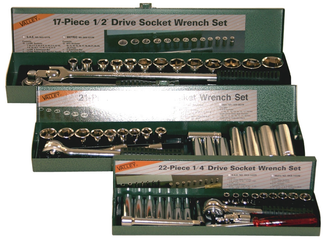 1/2" Dr. sockets: 7/16", 1/2", 9/16", 5/8", 11/16", 3/4",13/16", 7/8", 15/16", 1", 1-1/16", 1-1/8", 1-1/4"