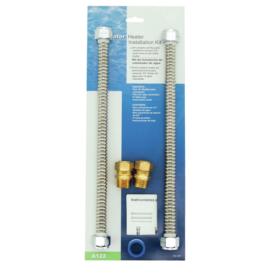 | Kit contains all parts needed to connect 3/4" water lines to water heater